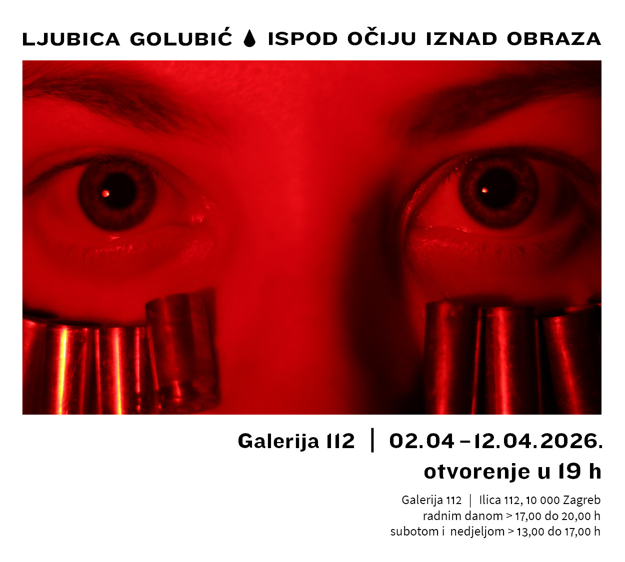 U četvrtak, 2. travnja, s početkom u 19 sati, u Galeriji 112 otvorit će se izložba „Ispod očiju iznad obraza” autorice Ljubice Golubić. Izložba ostaje otvorena do 12. travnja, radnim danom od 17 do 20 sati te subotom i nedjeljom od 13 do 17 sati.