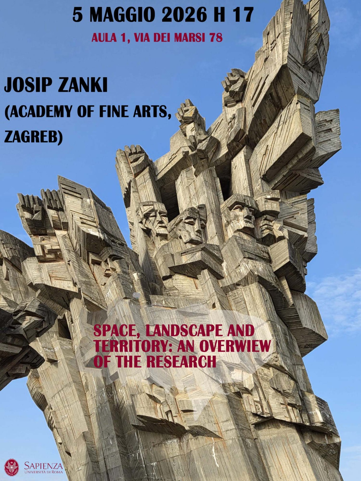 On May 5th, year 2026 at 5 p.m. at the University Sapienza (aula 1, Via dei Marsi 78) Assoc. Prof. Dr. Josip Zanki will adress public lecture "Space, Landscape and Territory: An Overview of the Research". The lecture is held as part of the Academy of Fine Arts professors and students fieldwork activities in Rome, in the project Space, Landscape and Territory: Creation of the Space, Decolonization of Public Space and Zone of Marginality.